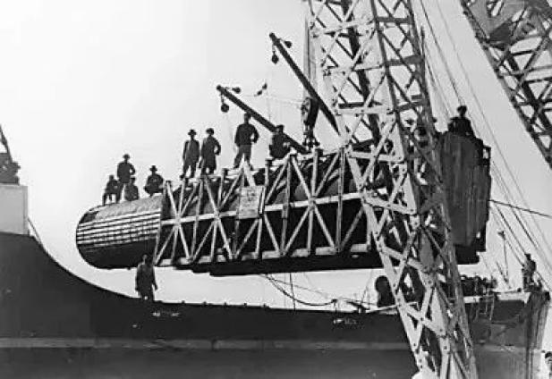 载着侯德榜追回的硝酸设备的轮船抵达码头,在原址上整顿修复。来源:光明日报